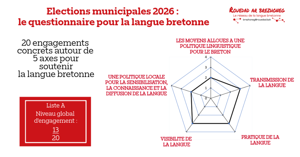 À l’occasion des élections municipales de 2026, «  Rouedad ar Brezhoneg » ( Le réseau de la langue bretonne, collectif d’associations œuvrant pour promouvoir la langue bretonne) présente le « Questionnaire pour la langue bretonne ».  Notre réseau avait fait de même pour les élections régionales en 2021 (voir notre rubrique actualités sur notre site).